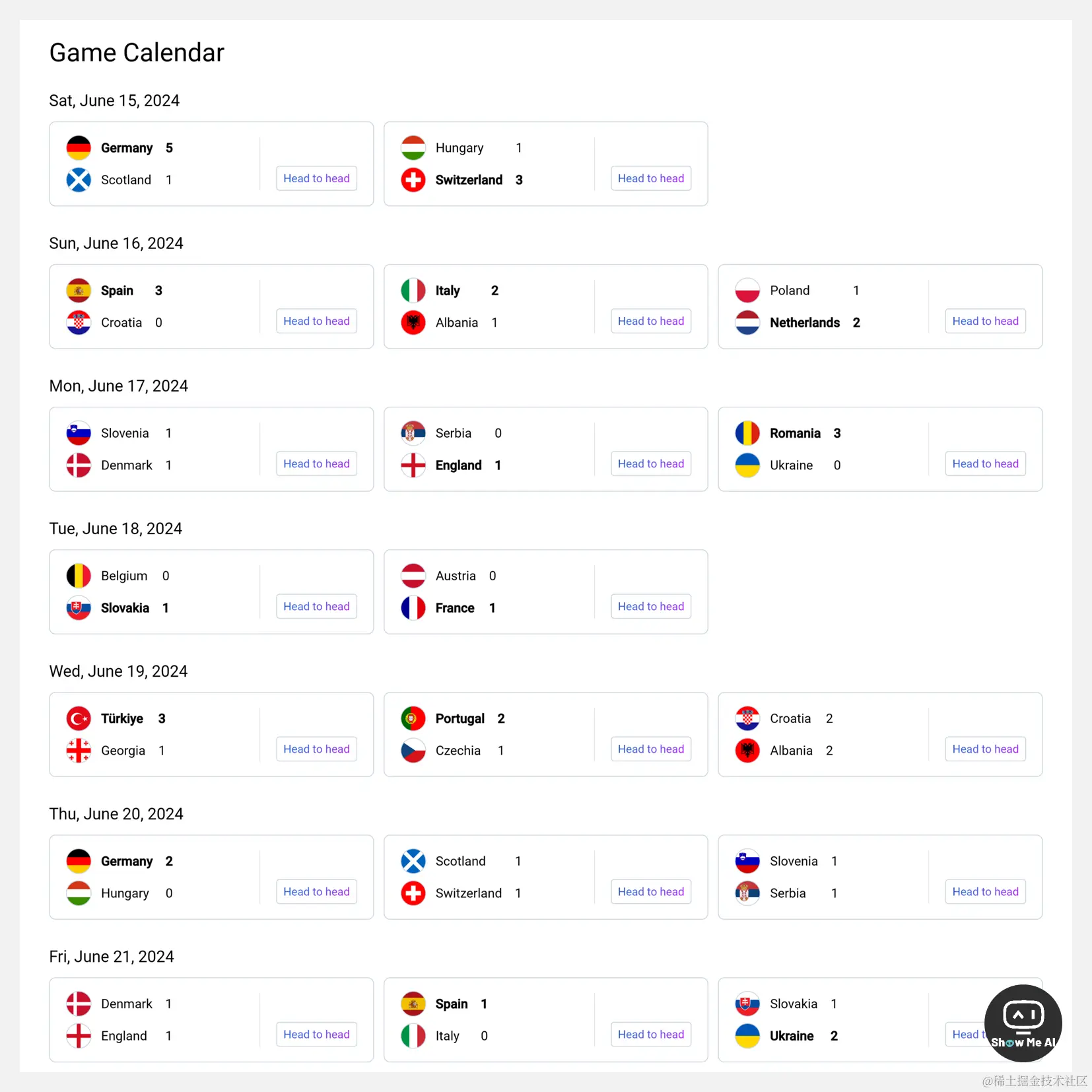 2024 年欧洲杯于6月14日至7月14日在德国举行,共有24支国家队参加。目前处于小组赛阶段。