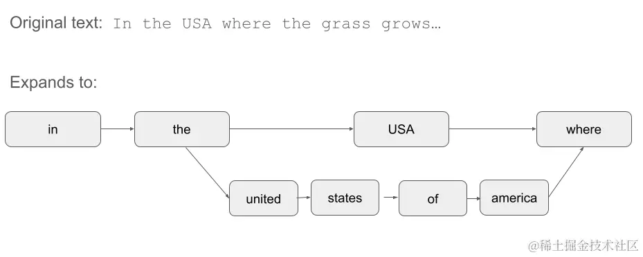 词汇分词流程实际上是一种图结构 - 在任何位置,等效的分词 (如同义词或不同的表达方式) 只是这个图上的一个分支,而且不同的分支可能长度不同 (例如,USA与United States of America)。