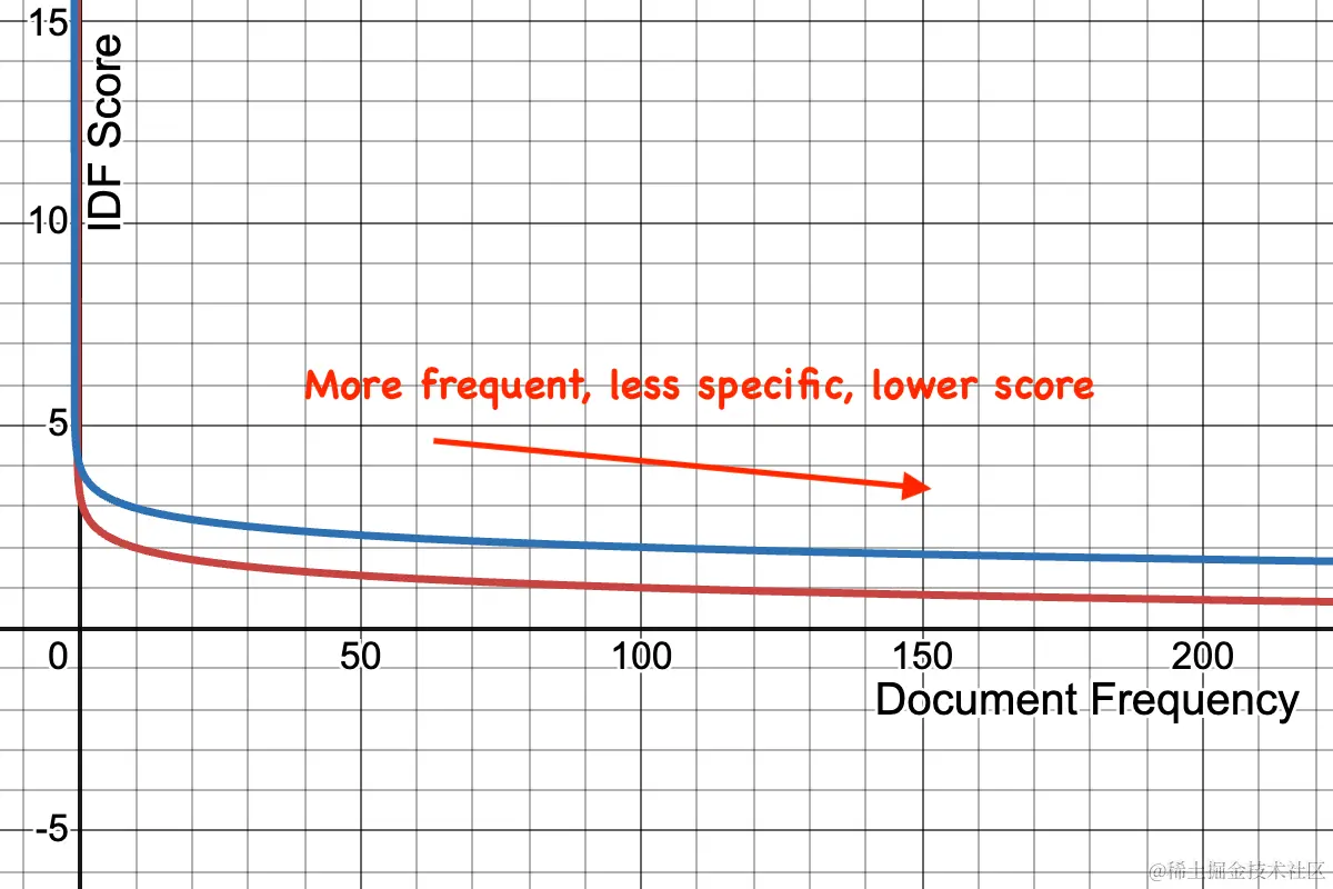实际上,IDF 并非原始的 IDF,每个相似度系统都有自己的非线性饱和 IDF 曲线。