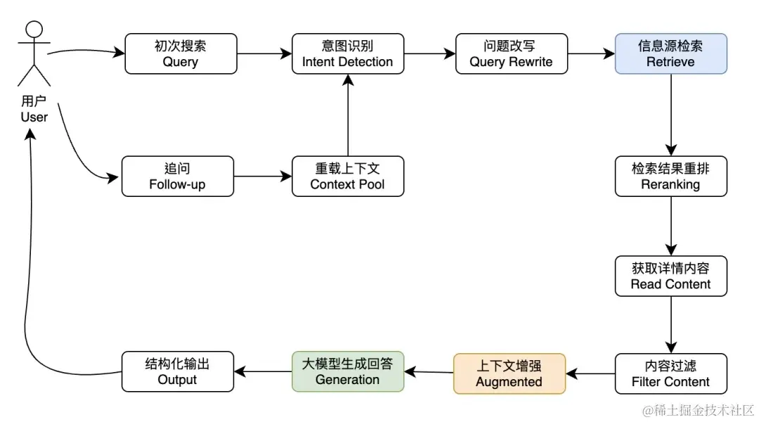 意图识别 Intent Detection:通过分析用户查询,判断其搜索意图,并决定是否需要联网检索,以提高搜索效率。