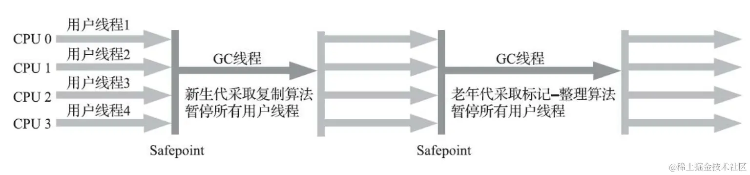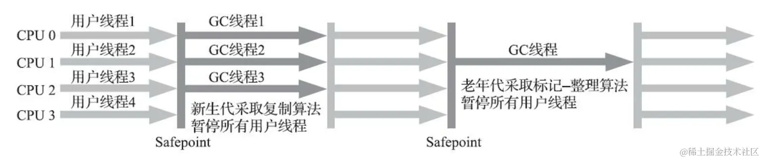 - 串行与并行:在垃圾收集的上下文中,串行执行意味着垃圾收集器的工作与应用程序的执行是交替进行的。具体而言,当垃圾收集进程运行时,需要暂停(或称为“停顿”)用户程序,待垃圾回收完成后再恢复应用程序的执行。这种模式在早期Java虚拟机中较为常见,适用于内存较小、CPU资源有限的环境。而并行执行模式,则允许垃圾收集器与用户程序并发执行,即垃圾收集操作不必完全停止应用程序。这样可以减少垃圾回收引起的程序停顿时间,提高整体系统的响应速度。CMS和 G1 收集器是Java平台中采用并行处理的代表,它们通过复杂的算法设计实现了垃圾收集的同时,保持了应用程序的持续运行,特别适合对延迟敏感的服务场景。