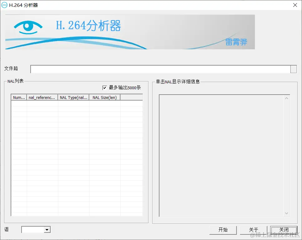 这里用到了雷霄骅雷神写的H264分析器,在此向雷神致敬,雷神10年前写的小程序至今仍然好用。打开H264分析器,该软件的初始界面如下图所示: