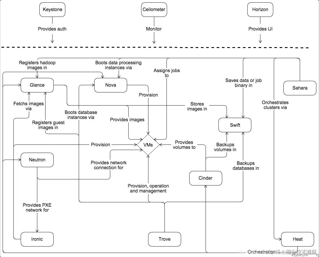 下图展示了OpenStack服务之间的关系,OpenStack由几个独立的部分组成,成为OpenStack服务。所有服务都是通过身份服务进行身份验证。各个服务通过公共API相互交互,除非需要特权管理员命令。
