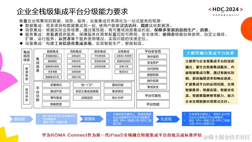 作为行业权威标准制订和测评机构,信通院推出了大模型融合集成平台标准和企业全栈级集成平台分级能力要求,作为新一代iPaaS全域融合智能集成平台华为云应用与数据集成平台ROMA Connect已首批完成标准评估。