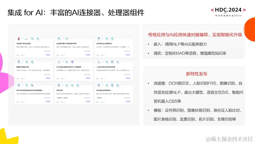 集成for AI 方面,传统AI典型的两种方式是嵌入和调优,嵌入方面预置了很多AI 服务的连接器,通过调用可实现给传统应用加强智能化能力。在调优的方面,支持RAG模式,通过把数据处理后放到相关数据库里边,增强大模型领域知识能力,降低大模型幻觉问题。