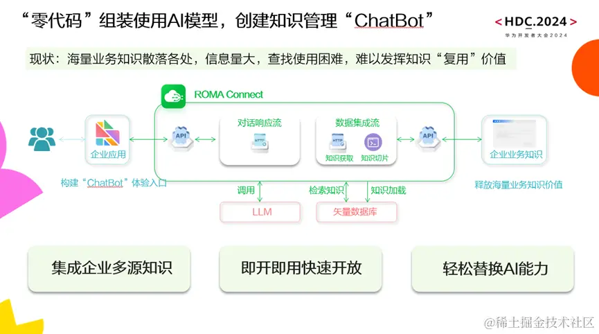 同时,也可以通过编排矢量数据库和大模型的方式,去更加便捷灵活地进行内容检索和提示设计,并快速开放问答API,搭建对话响应流实现RAG技术中检索增强和生成的部分。在华为云应用与数据集成平台ROMA Connect上,这两条流在一键启动部署后,将API集成进企业已有应用,即可构建chatbot的体验入口,完成传统知识管应用的智能化改造。