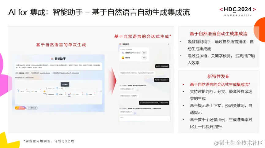 第一种模式方面,华为云应用与数据集成平台ROMA Connect去年发布的智能助手可以通过自然语言生成集成流。通过一年多的迭代和数千个场景用例对模型的训练,当前准确率相比上一代已经上升了两倍以上。可以处理更复杂场景的应用用,对于上下文的理解能力也更加强大,输出过程中可以实时反馈并进行技术提示。