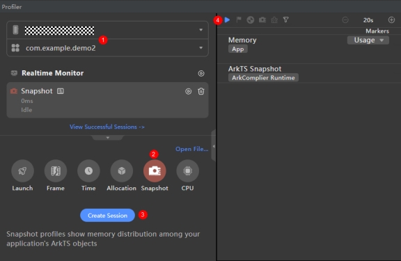 “Take Heap Snapshot”按钮来创建内存快照,“ArkTS Snapshot”泳道的紫色区块表示一次快照完成。
