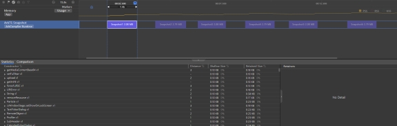 ArkTS Snapshot泳道的紫色色块代表抓取的内存快照,点击色块查看快照中的内存详情分析。“Statistic”页签中显示当前快照的详细信息,包括构造函数名称、从GC roots到这个对象的层级深度、自身内存大小、相关内存大小等。