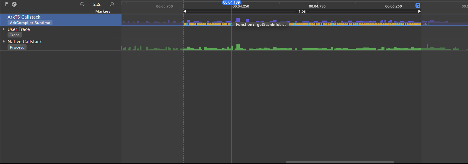 分析:通过耗时分析工具Time Profiler对页面跳转过程进行录制并分析,观察ArkTS Callstack泳道发现该过程频繁调用getScanInfoList方法,产生阻塞。