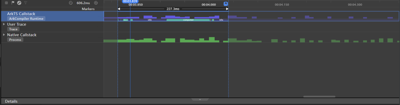 在ArkTS Callstack泳道中,当前应用进程的computed耗时任务由3.4s变为227ms,性能优化明显。