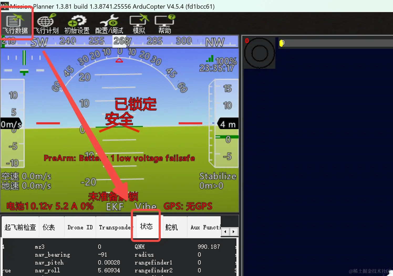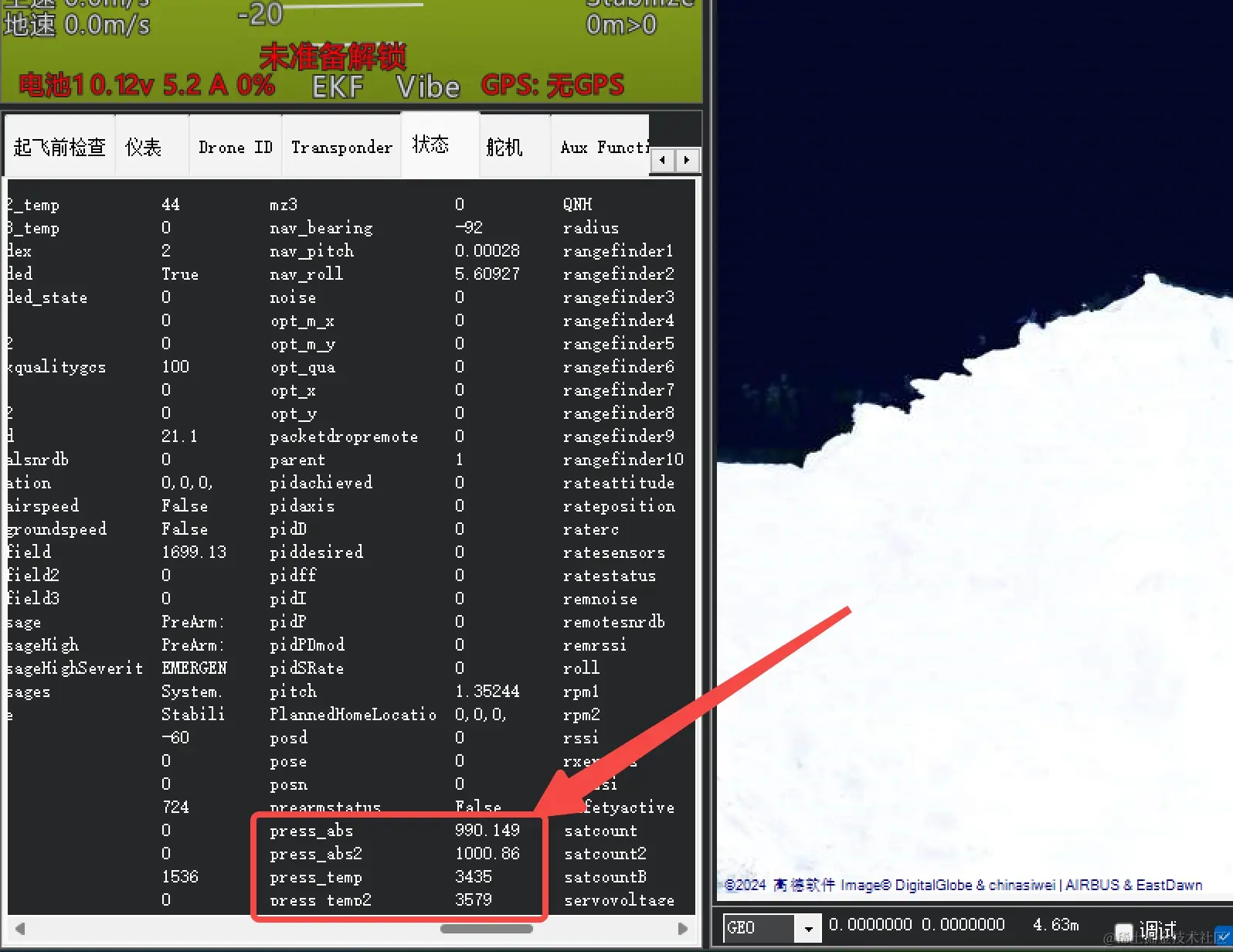 再切换到飞行数据 -> 状态栏,找到 press_abs 和 press_temp状态,注意看我们这里有 press_abs 和 press_abs2,press_temp 和 press_temp2 四个状态,其中无后缀的是我们的外置气压计模块,有后缀2的是飞控的内置气压计模块,这个顺序与我们上文提到的顺序一致。