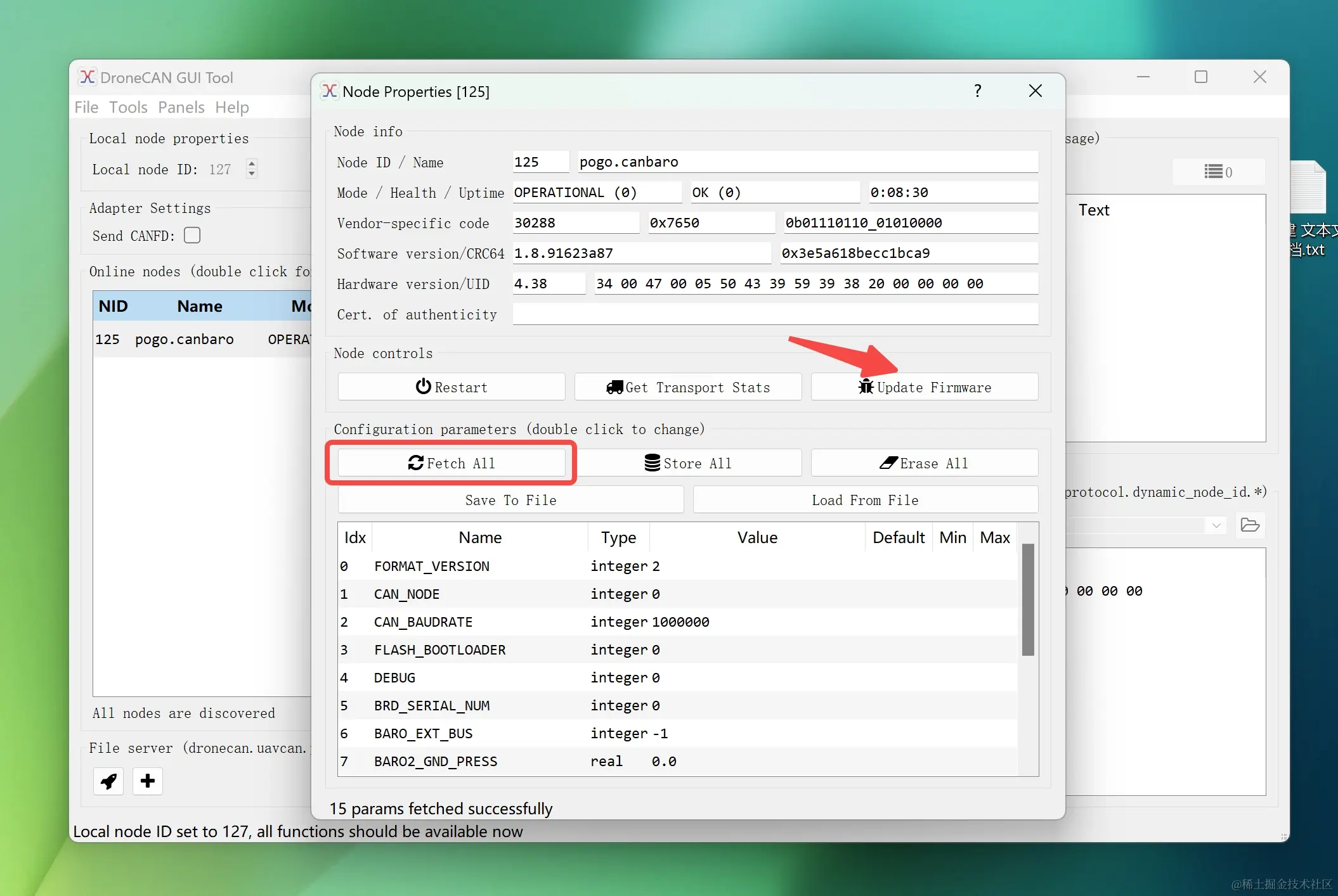 双击该Pogo-DroneCAN气压计节点,DroneCAN_GUI_Tool会为该节点打开一个Node属性页面,你可以在该页面点击FetchAll查看和修改DroneCAN气压计的所有参数,也可以点击Update Firmware更新该气压计的固件。Pogo智能科技的该款DroneCAN气压计不需要修改任何参数