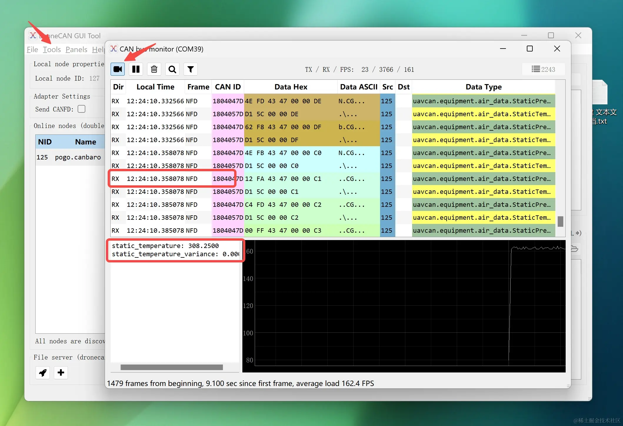 关闭Node属性页面,在Tools -> bus monitor 打开can bus monitor页面,在该页面点击左上角的摄像头icon,可以看到上位机收到了DroneCAN气压计源源不断发过来的数据,任意点击几条数据查看它的详情,气压计会对外发送两组数据,分别为temperature和 pressure。