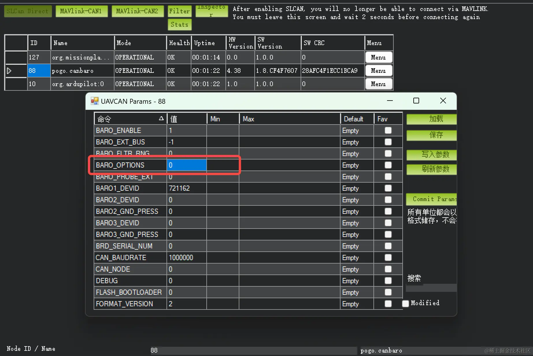 然后对飞控和模块重新上电并重新连接到MissionPlanner,再次查看一下Pogo-DroneCAN MS5611 气压计节点的所有参数,可以看到BARO_OPTIONS参数的值从0修改为了1,符合我们的预期。
