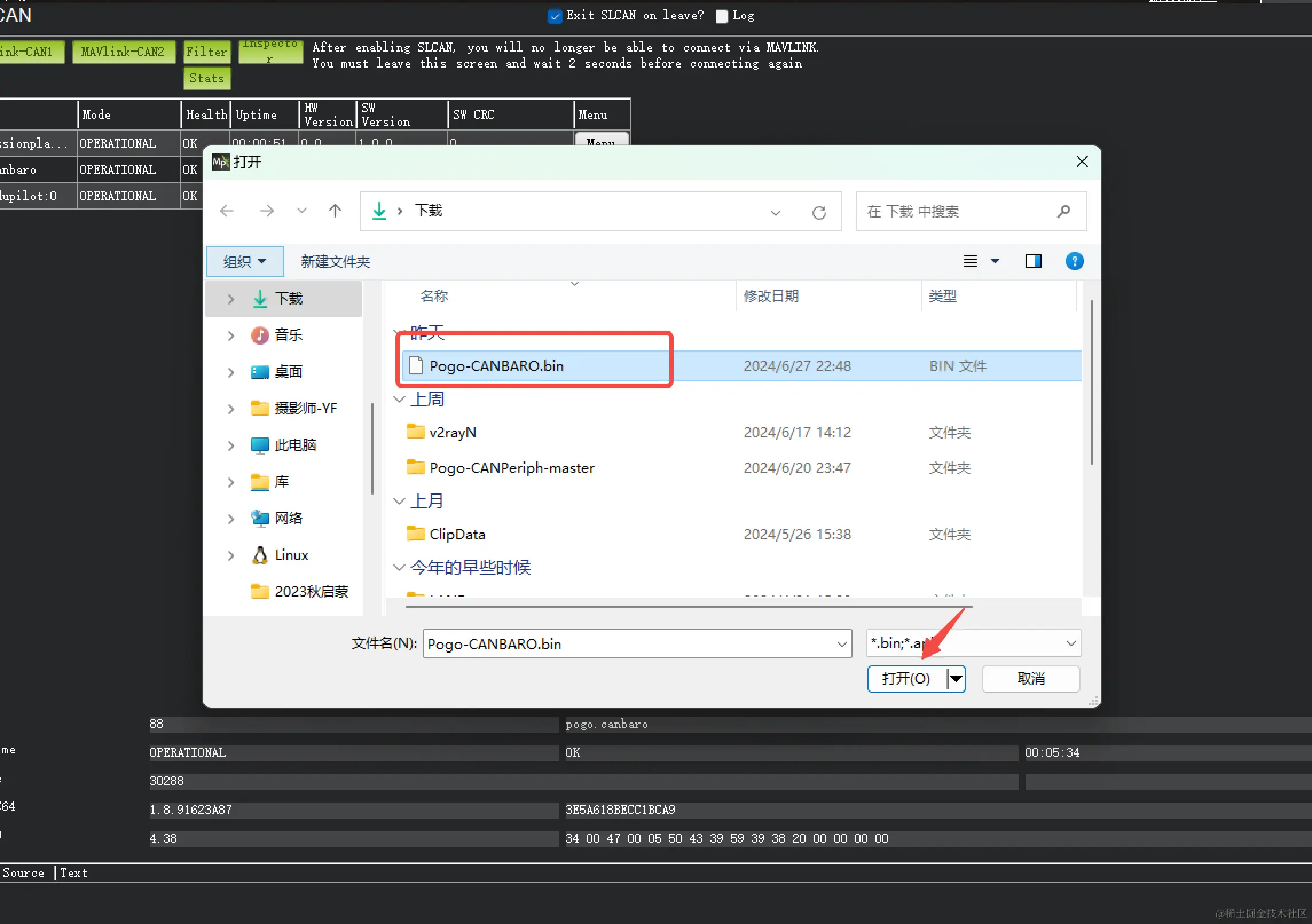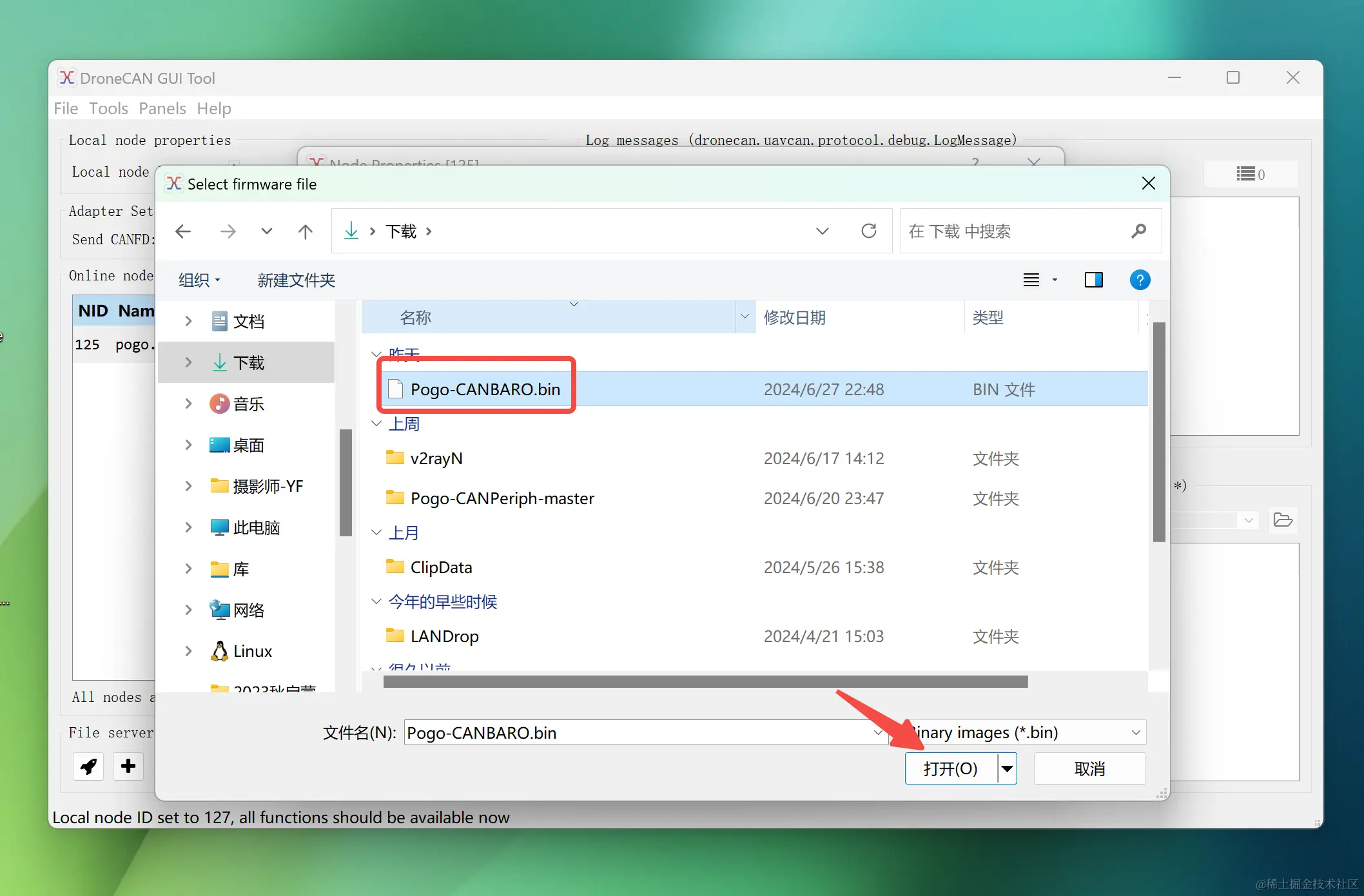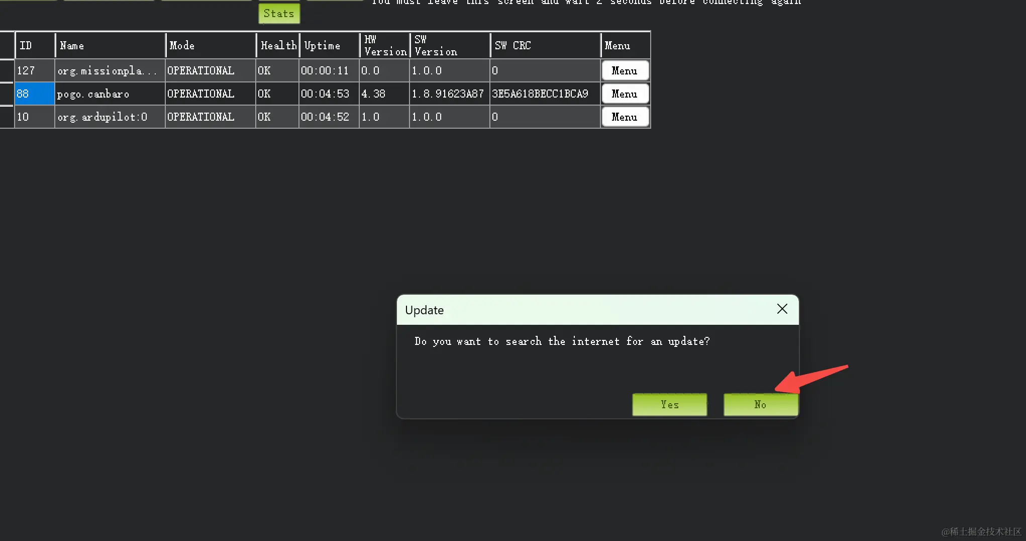 我们先来更新一下该Pogo-DroneCAN MS5611 气压计的固件,点击menu->update,它会弹出是否从互联网搜索更新,选择No,然后在弹出的对话框选择最新的固件,并点击打开,等待节点完成固件的更新。