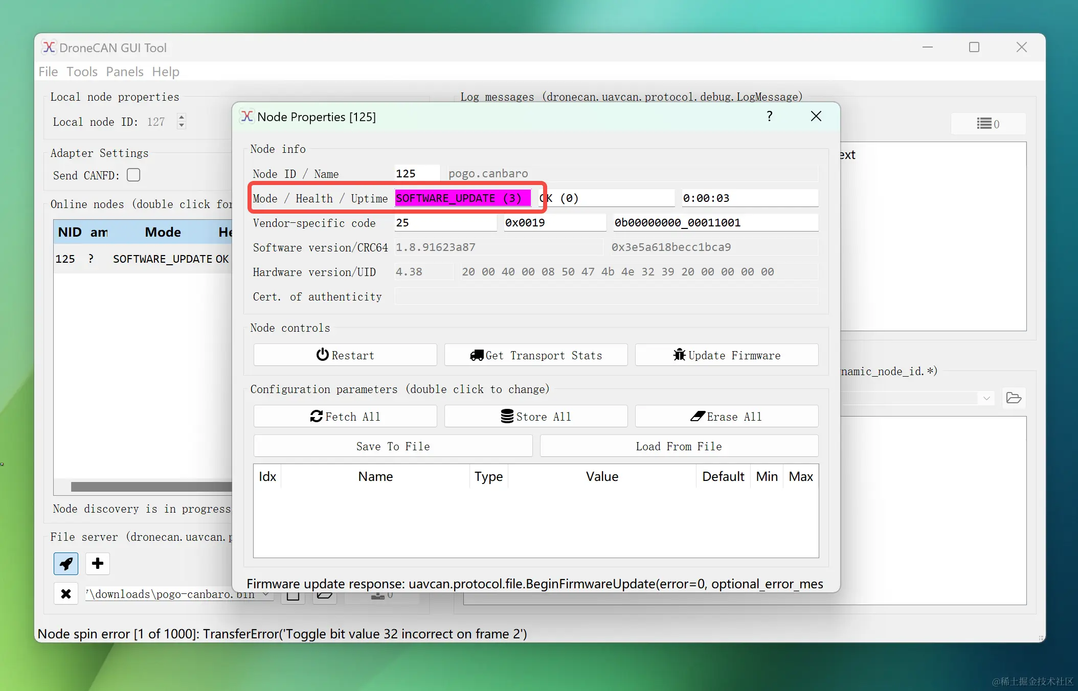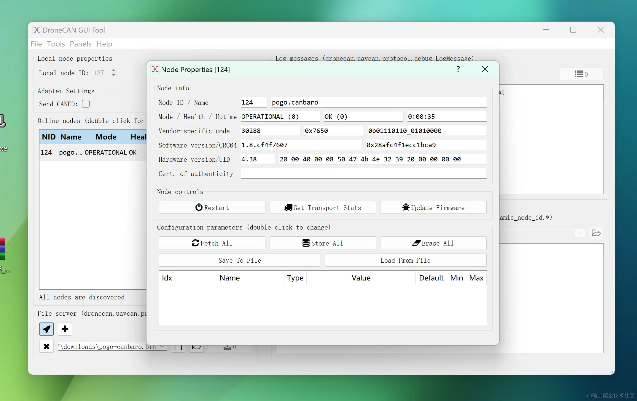 双击该Pogo-DroneCAN气压计节点,DroneCAN_GUI_Tool会为该节点打开一个Node属性页面,你可以在该页面点击FetchAll查看和修改DroneCAN气压计的所有参数,也可以点击Update Firmware更新该气压计的固件。