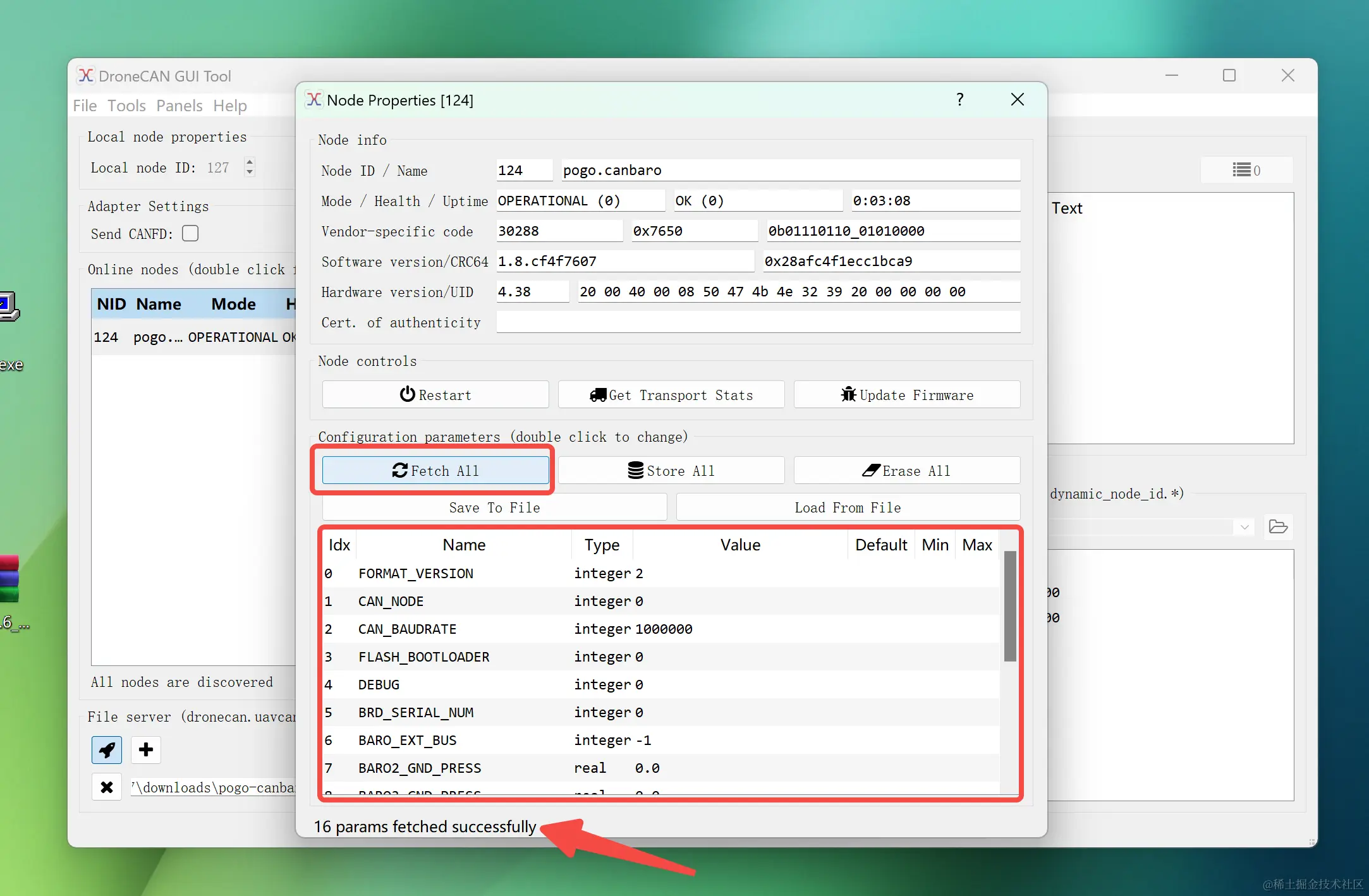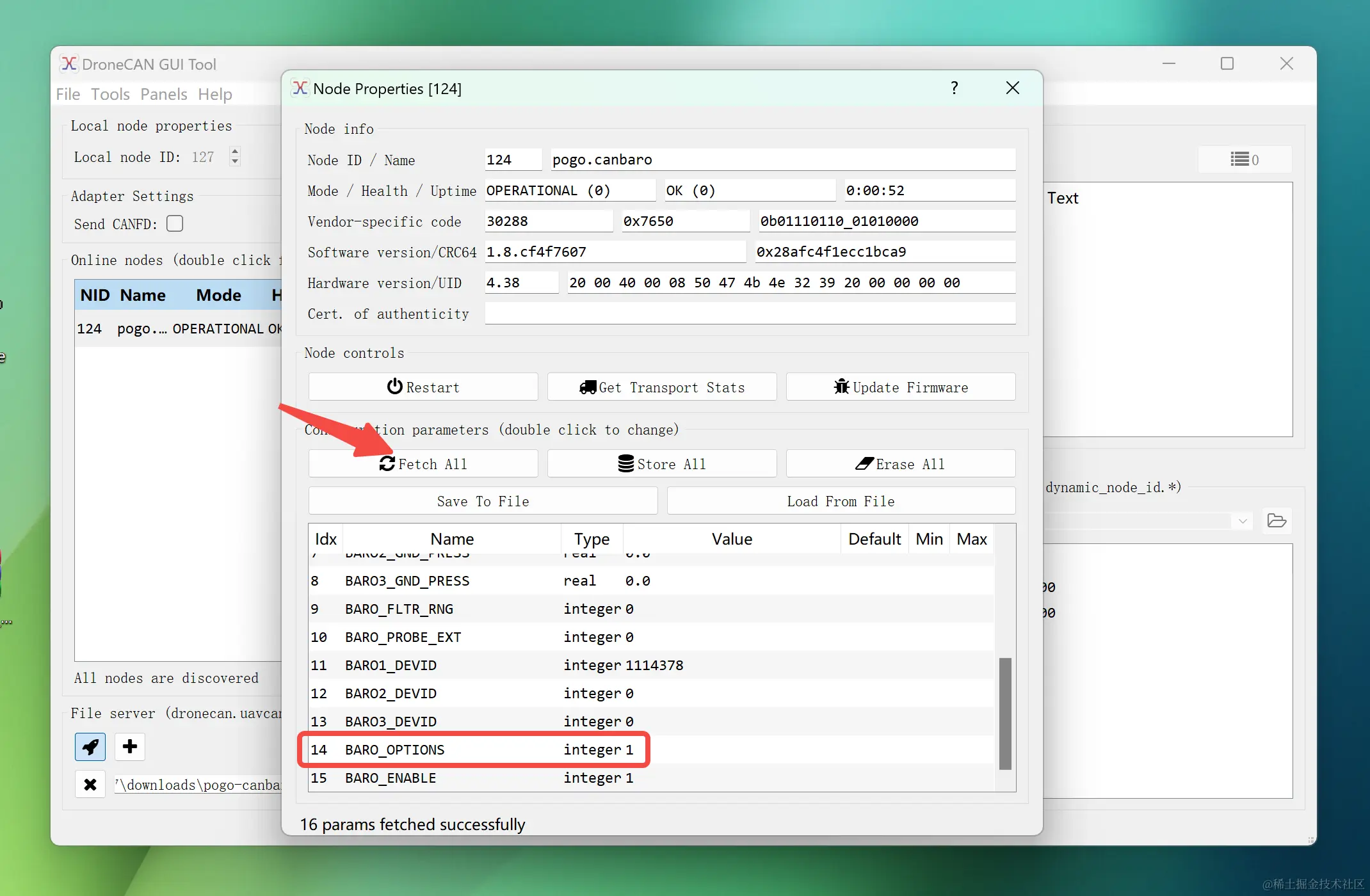 然后我们来更新一下模块的参数,这里依旧以我们刚刚更新了固件的Pogo-DroneCAN MS5611 气压计模块为例,点击Fetch All 获取该模块的所有参数。