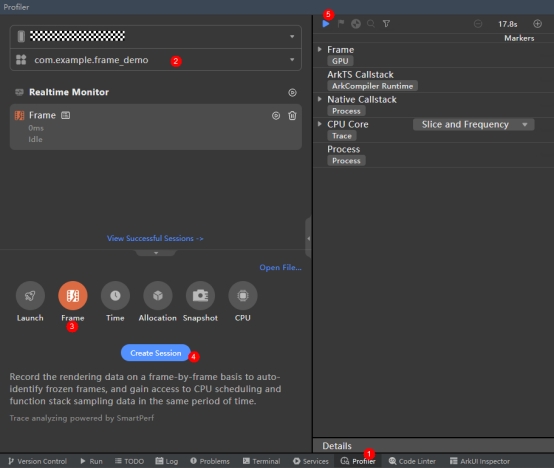 DevEco Studio内置Profiler分析调优工具,其中Frame分析调优功能,用于录制GPU数据信息,录制完成展开之后的子泳道对应录制过程中各个进程的帧数据,主要用于深度分析应用或服务卡顿丢帧的原因。此外,Frame任务窗口还集成了Time、CPU场景分析任务的功能,方便开发者在分析丢帧数据时同步对比同一时段的其他资源占用情况。