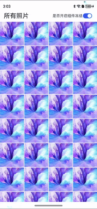 上图是一个使用Grid懒加载的仿图库长按图片显示复选框的场景。下面将基于该场景对比分析冻结能力使用前后的性能差异。