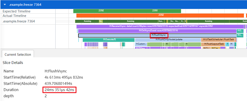 如图3所示,在Grid预加载GridItem数量设置200的情况下,开启组件冻结功能,抓取长按图片显示复选框的trace。可以看出显示复选框的FlushVsync耗时仅为24ms。其中FlushDirtyNodeUpdate耗时10ms,UITaskScheduler::FlushTask耗时5ms。和不开启冻结功能的耗时相比缩短了11倍。
