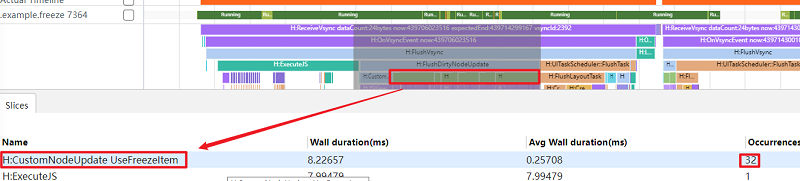 如图4所示,FlushDirtyNodeUpdate里执行了32个CustomNodeUpdate UseFreezeItem(自定义组件节点刷新)任务,这里的32个自定义组件节点指的是屏幕内可见的所有GridItem节点。和图2相比,可以发现开启冻结功能比不开启冻结功能少执行了800个自定义组件节点的刷新任务,大大缩短了渲染耗时。
