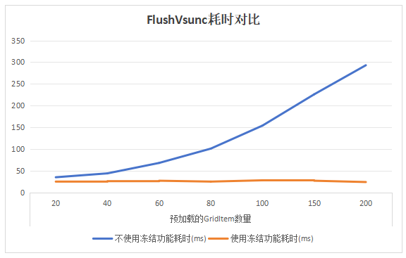 图5为Grid懒加载场景下,设置不同预加载缓存GridItem数量(cachedCount)的FlushVsunc耗时对比图。可以看出懒加载中设置的预加载缓存GridItem的数量越大,FlushVsync耗时越长。