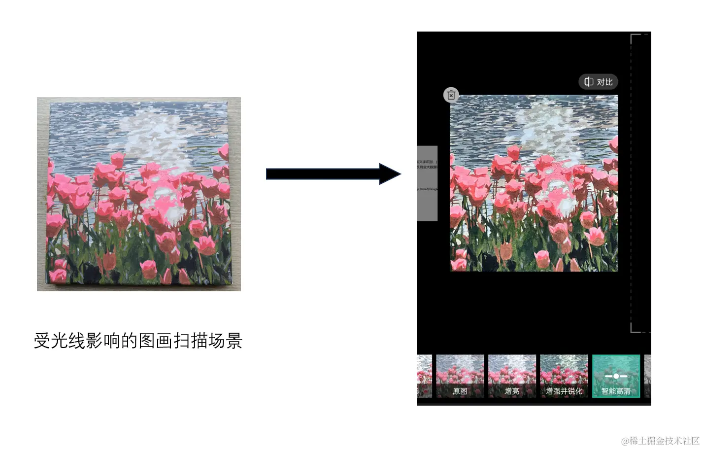 受光线影响的图画扫描场景:光线不均匀或过强可能会影响图画的扫描质量。通过实测,可以发现,智能高清滤镜2.0能够调整光线效果,减少阴影和反光,并保留图画的细节。