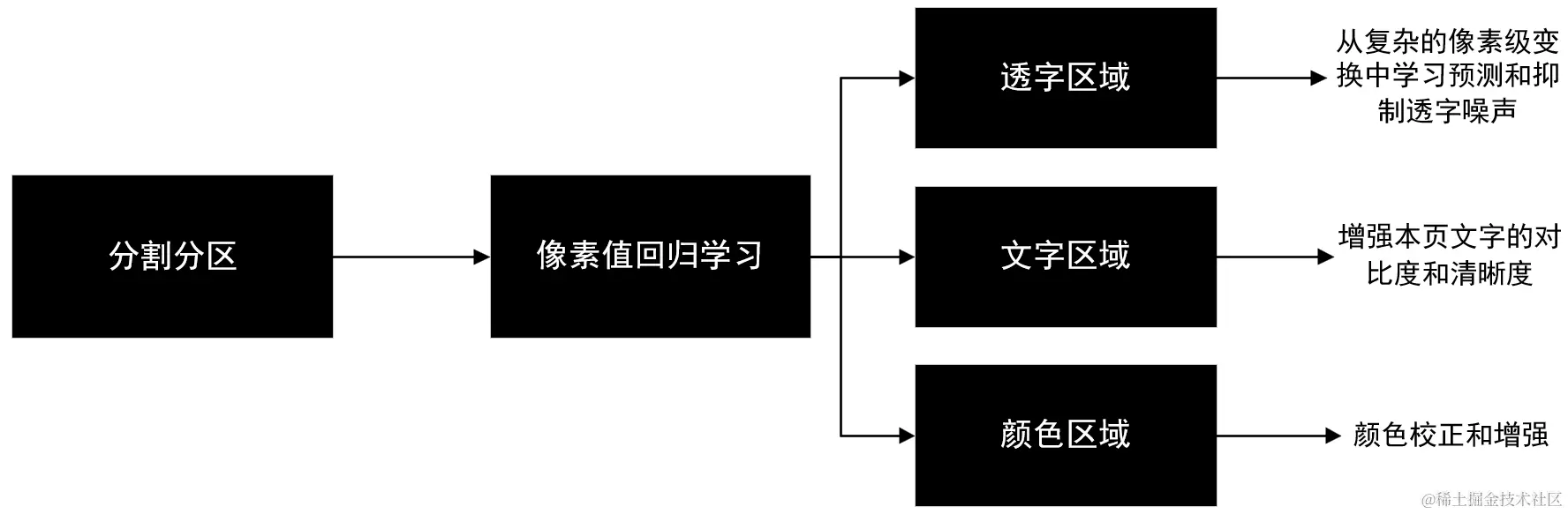 其次,算法利用像素值回归学习来处理识别出的各个区域: