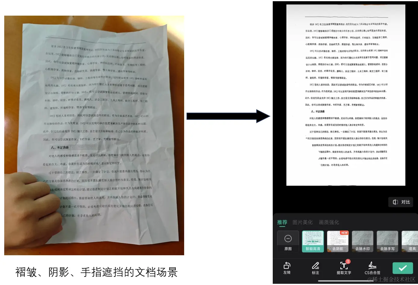 褶皱、阴影、手指遮挡的文档场景:文档可能因为折叠、阴影或手指遮挡而难以清晰扫描。可以看到智能高清滤镜2.0能够识别并处理这些物理缺陷,提供高质量的扫描结果。