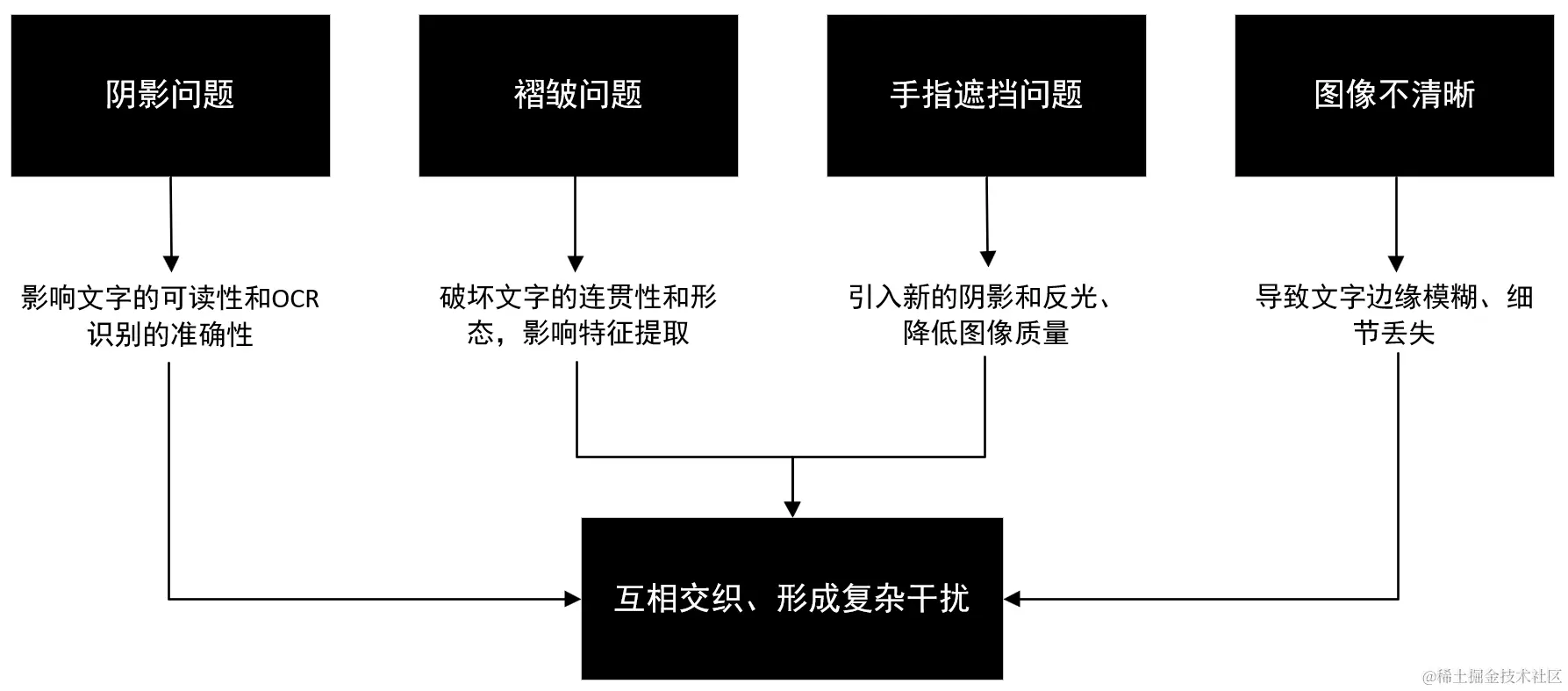 然而,在实际应用场景中,这些问题往往不是孤立出现的,而是相互交织在一起,例如,一张图像可能既有手指遮挡,又有阴影褶皱,图像整体还不清晰,手指遮挡在文档上投下阴影,褶皱使文字变形,而低分辨率或模糊的图像质量则进一步降低了文字的可识别性。在这种情况下,单一的解决方案不足以应对这些复杂的干扰。