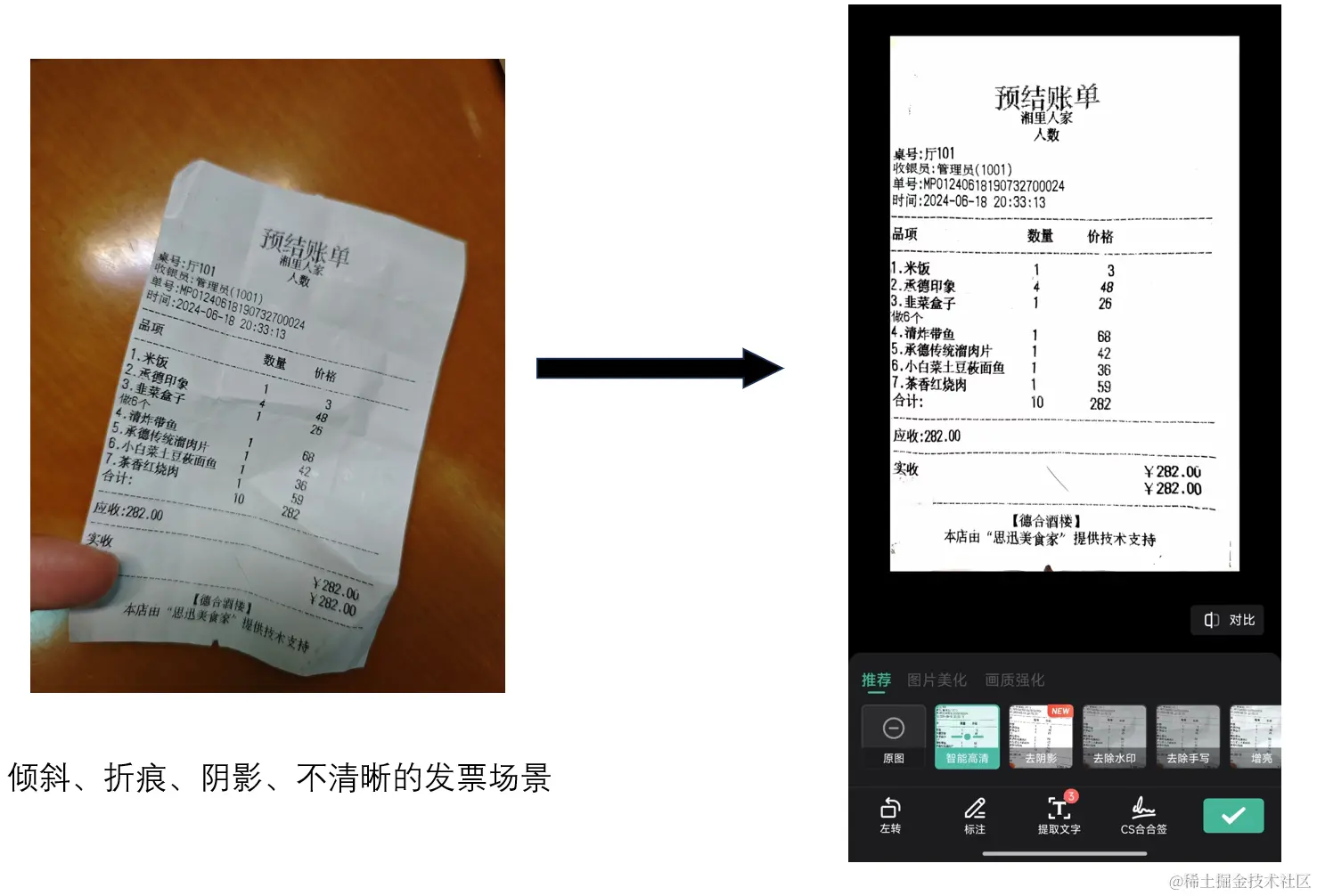 倾斜、折痕、阴影、不清晰的发票场景:发票可能因为放置不当、折痕或阴影而难以识别。通过实测可以发现,智能高清滤镜2.0能够校正倾斜,减少折痕和阴影的影响,并提高清晰度。