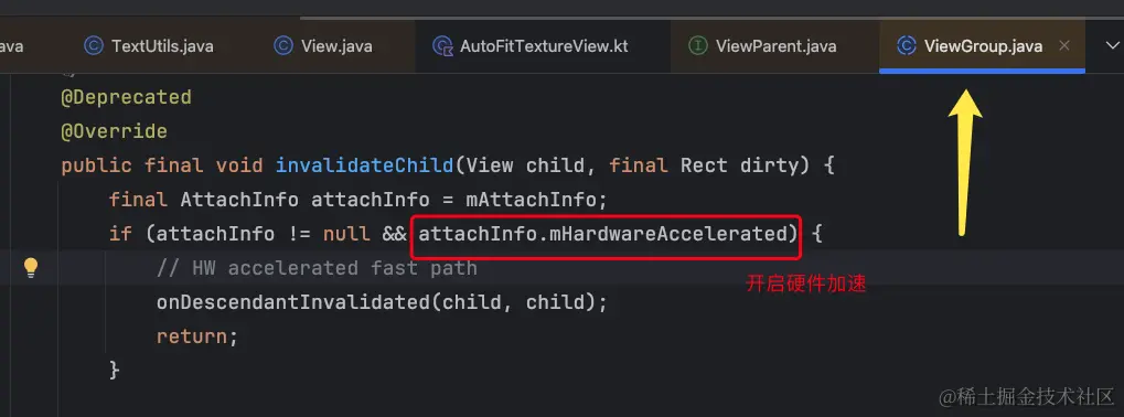 invalidate 方法内部层层调用走到了 viewgroup 的 invalidateChild方法