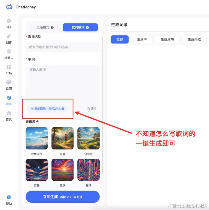 最近发现ChatMoney这款全能AI知识库系统不仅可以聊天绘画、创建机器人,还可以创作音乐。只要一分钟,人人都能用AI创作歌曲。