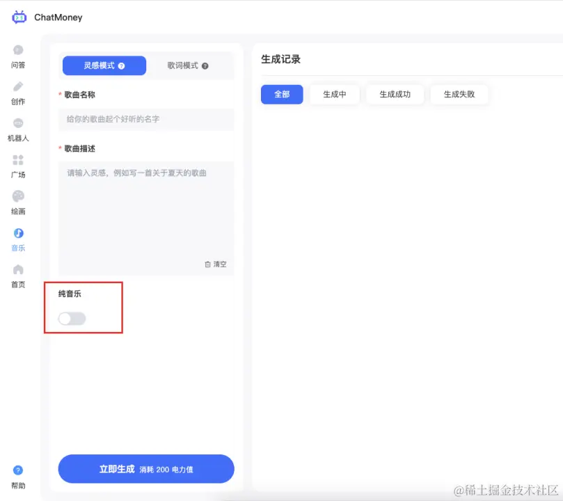 ChatMoney这款全能AI知识库系统怎么创作音乐呢?下面我将为您操作下: