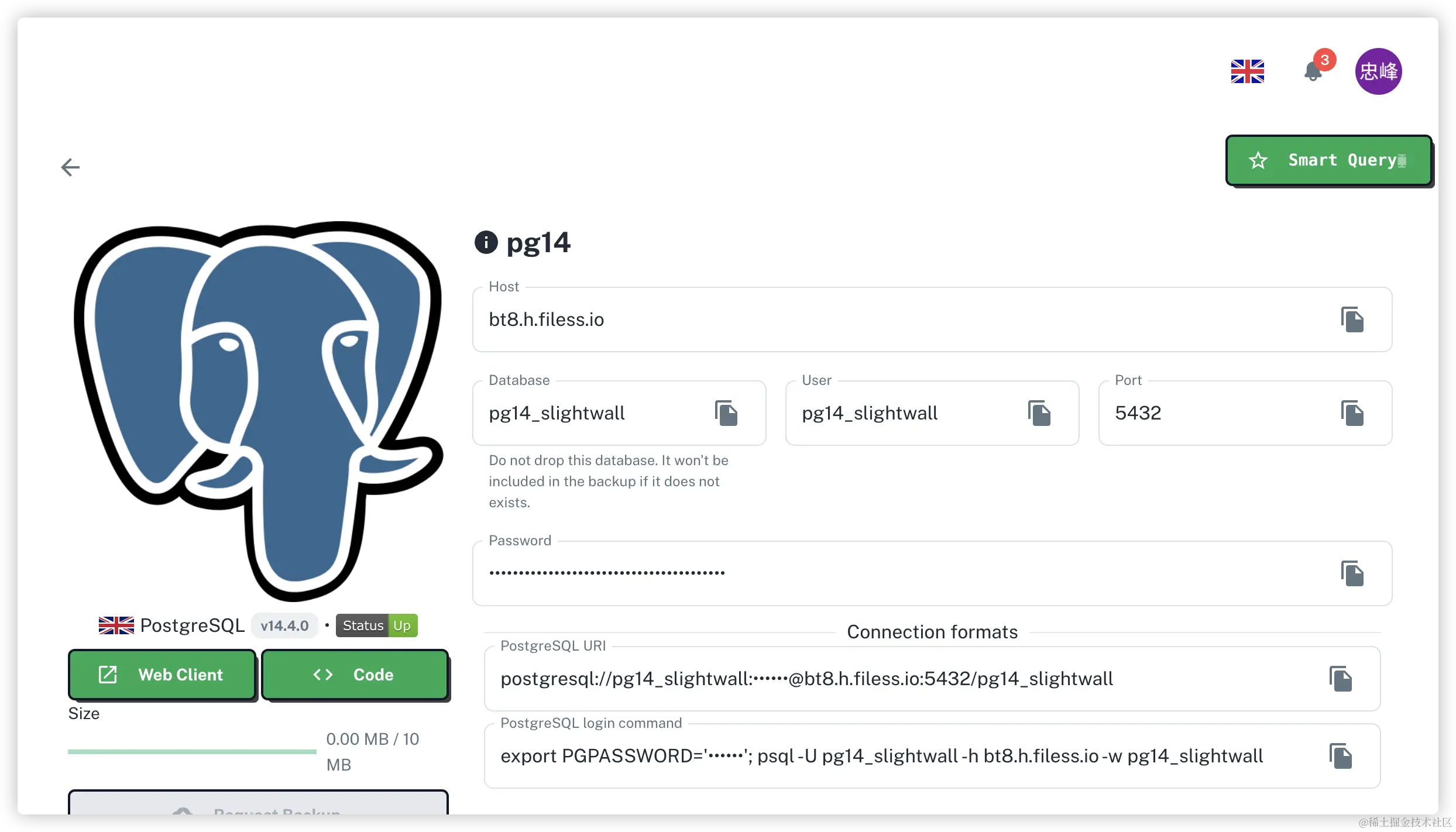 然后在项目里面创建 pg,成功后现实需要的参数,这里的端口是默认的5432