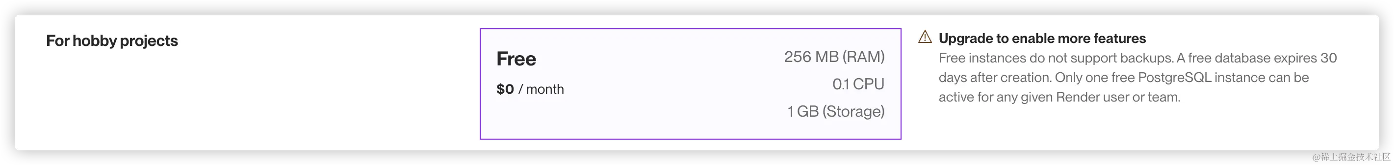 免费实例不支持备份。免费数据库在创建后30天过期。对于任何给定的Render用户或团队,只能激活一个免费的PostgreSQL实例。