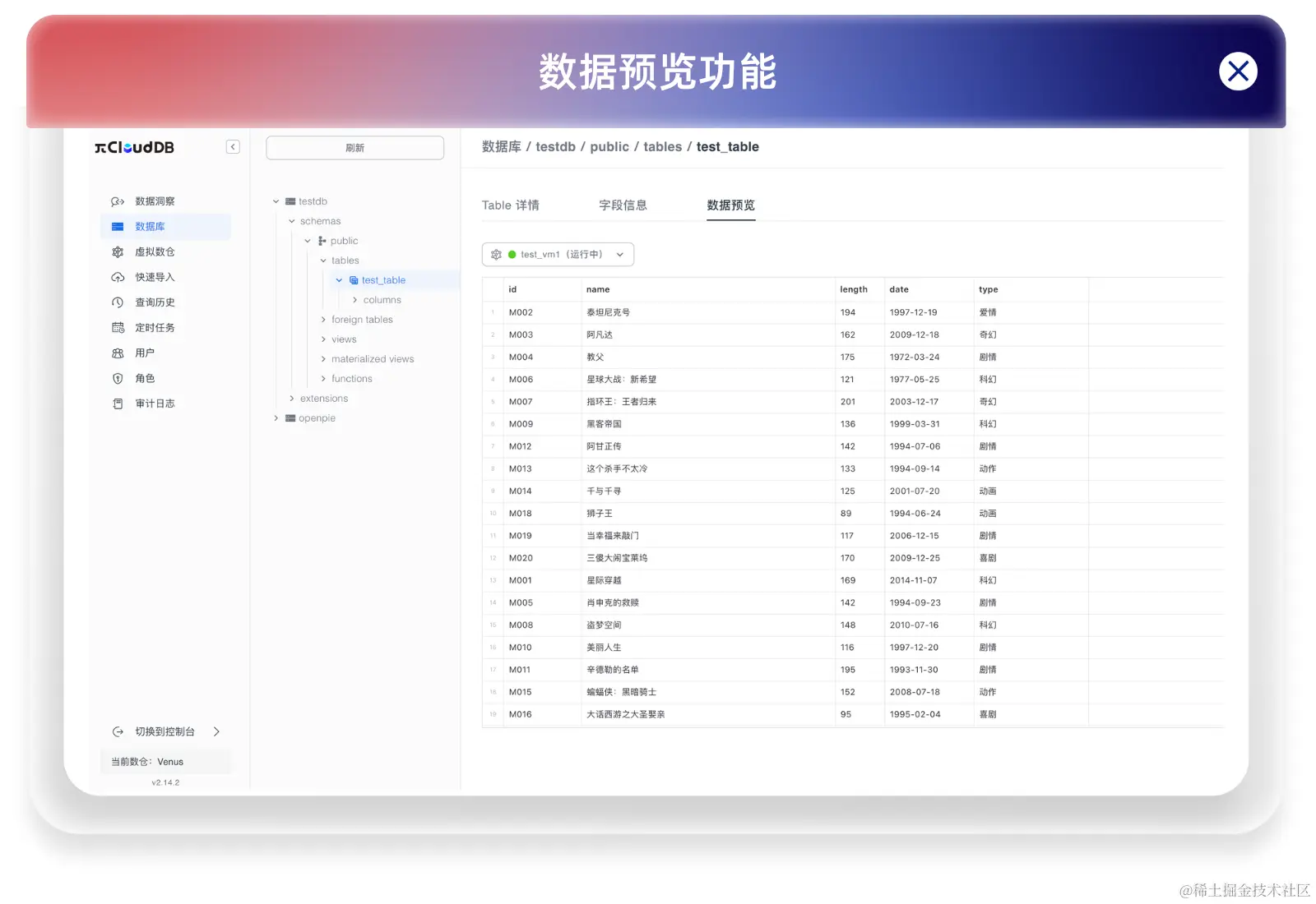 PieCloudDB 云原生平台新增表、外表、视图、物化视图的数据预览功能,提升了用户体验和数据操作灵活性。通过可视化的用户界面,被授予相关权限的用户可以轻松查看和管理数据结构,快速便捷获取业务洞察。