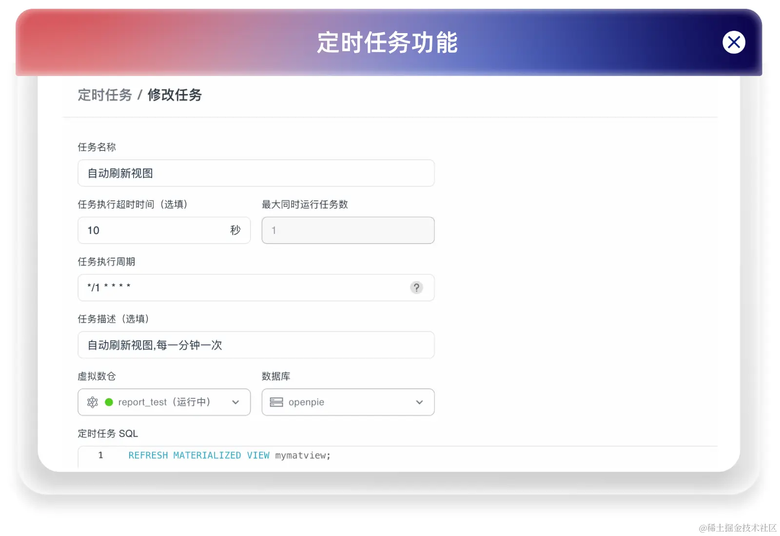 PieCloudDB 可视化云原生平台新增定时任务功能。定时任务支持在预定的时间点或时间间隔内自动执行任务,可应用在定期执行后台任务、生成报告、清理垃圾数据,更新数据和执行自动化操作等场景,为数据库管理员和开发人员提供了进一步的便捷。