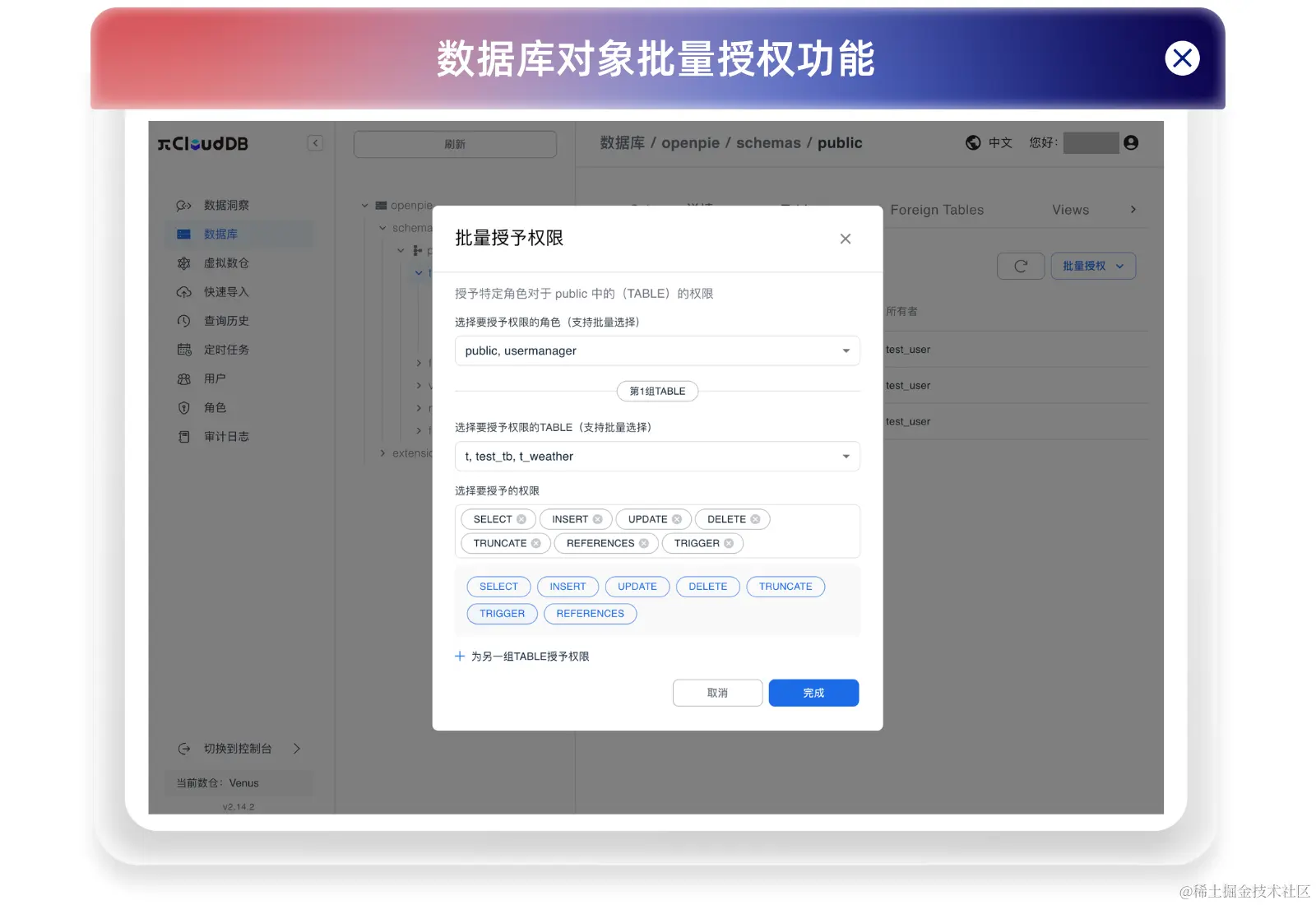 PieCloudDB 云原生平台优化了数据库对象授权功能,新增「批量授权」选项,支持对多个角色批量授予多个同类数据库对象不同权限,减少用户操作步骤。