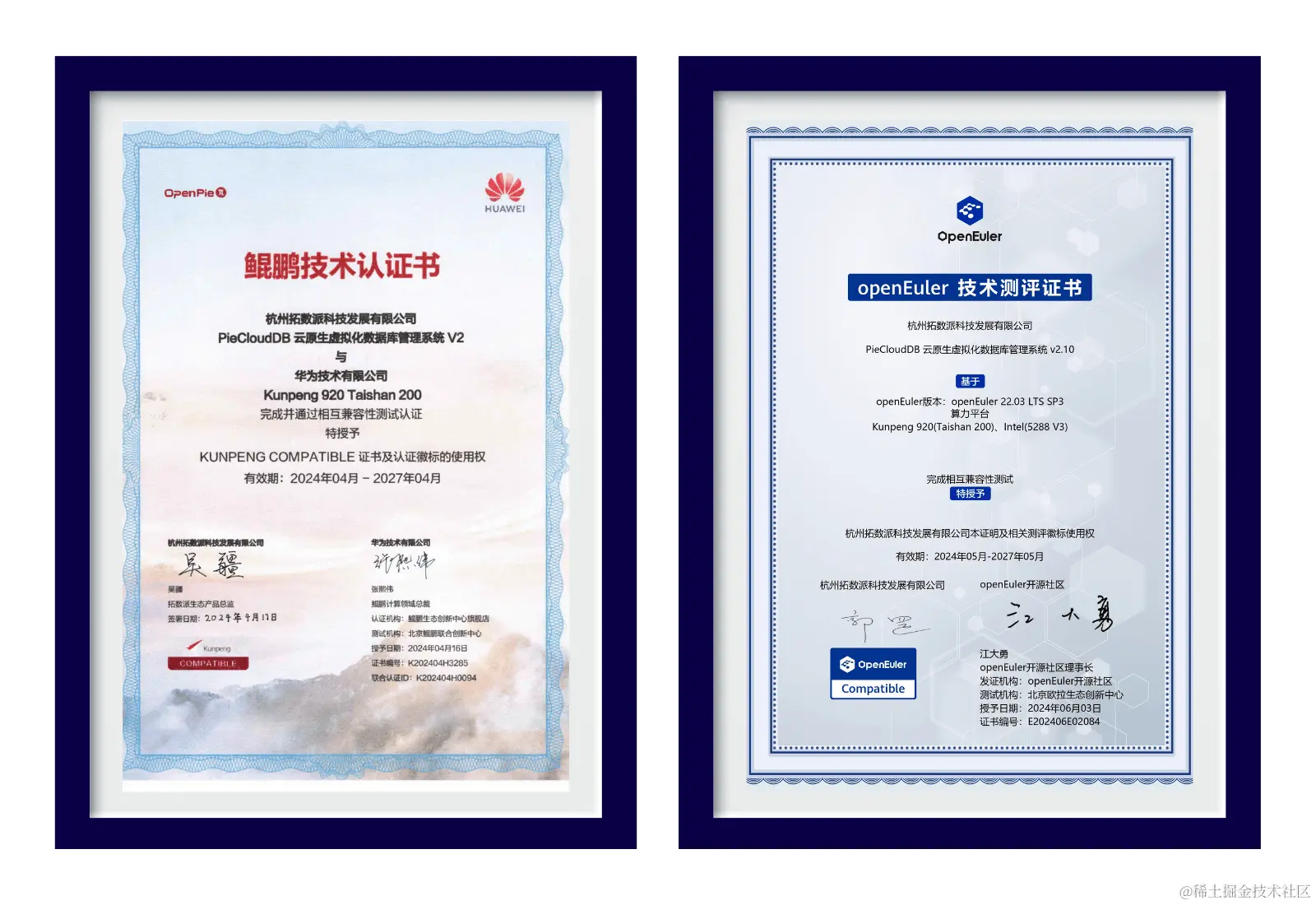 - PieCloudDB 新增华为鲲鹏 920 与 openEuler 兼容性认证证书