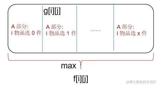 完全背包问题也是根据第 i 件物品的选择数量,把 g[i][j] 划分成不同的部分,分别求出各个部分的最大值,取各个部分最大值中的最大值,就是整体 g[i][j] 的最大值,也就求出了 f[i][j]。