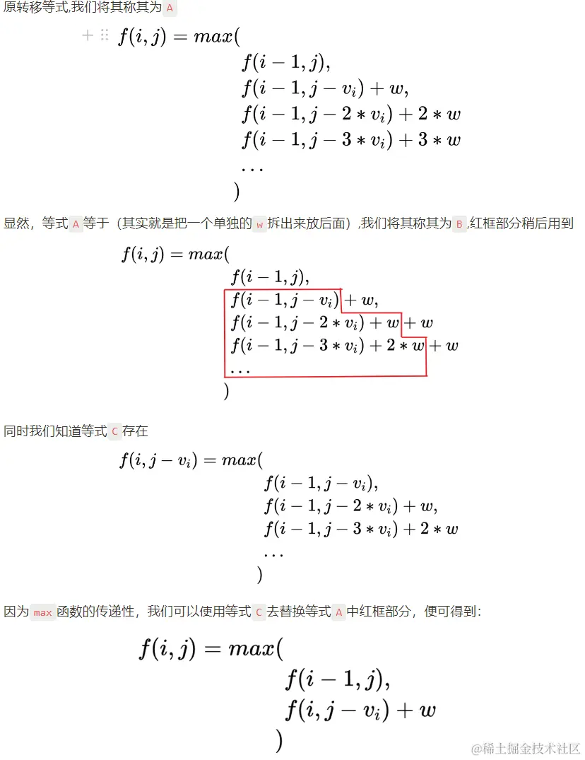 展开式为:f[i] [j] = max( f[i-1][j] , f[i - 1][j - vi 𝑣 𝑖 ]+w , f[i - 1][j - 2 * vi 𝑣 𝑖 ] + 2 * w , f[i - 1][j - k * vi 𝑣 𝑖 ] + k * w , .....) 其中 k <= j / w。