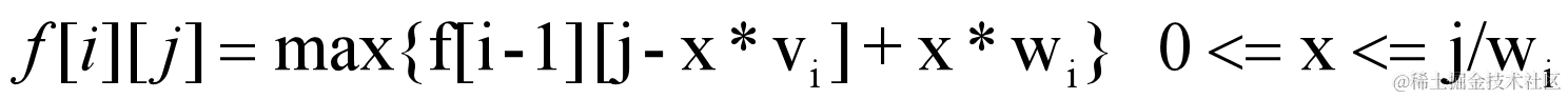 f[i][j - vi 𝑣 𝑖 ] = max( f[i-1][j - vi 𝑣 𝑖 ] , f[i-1][j - 2 * vi 𝑣 𝑖 ] + w , f[i-1][j - 3 * vi 𝑣 𝑖 ] + 2 * w , .....) 。
