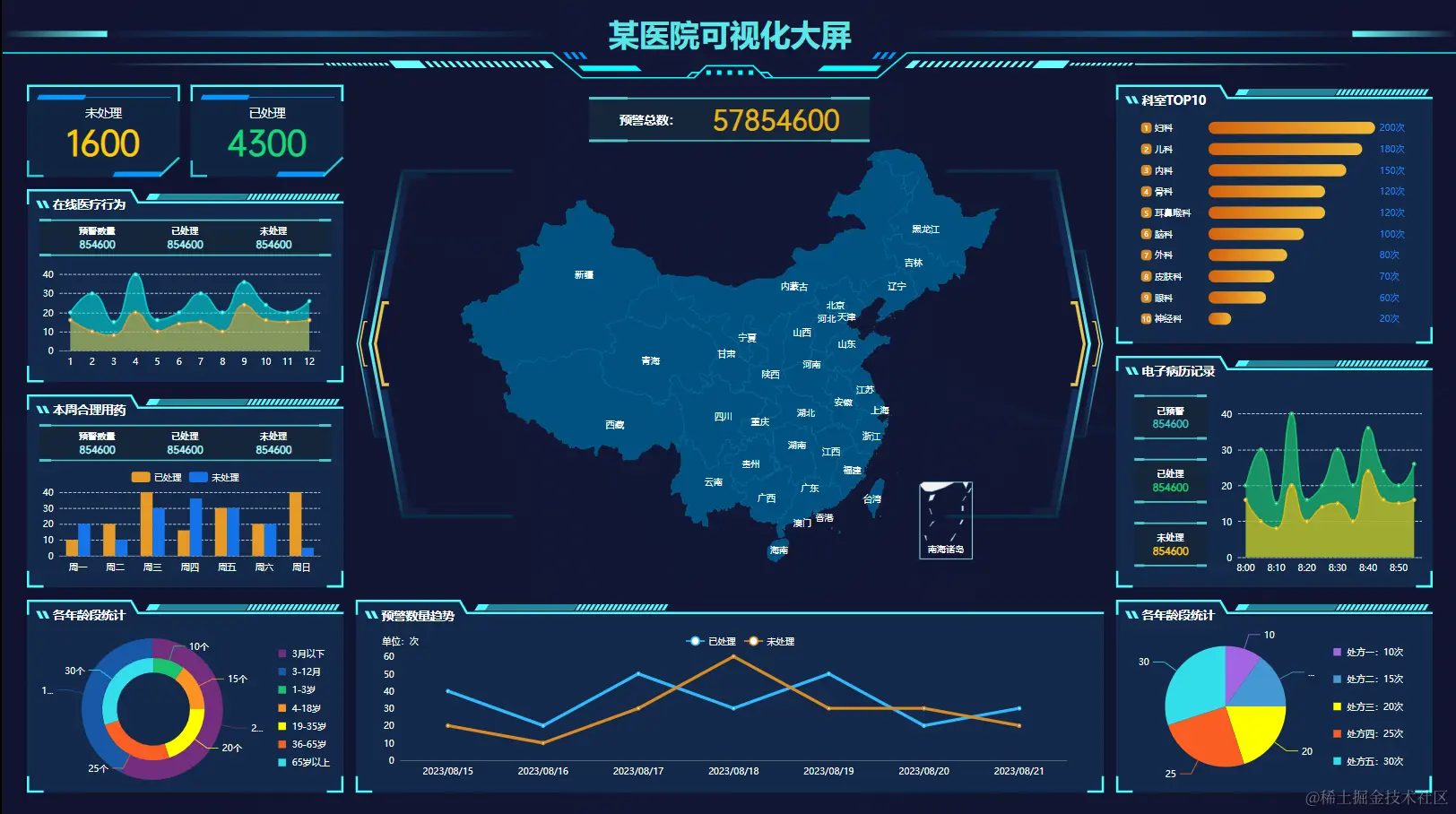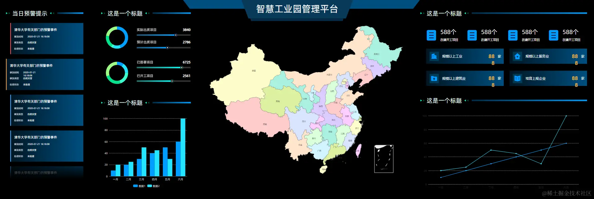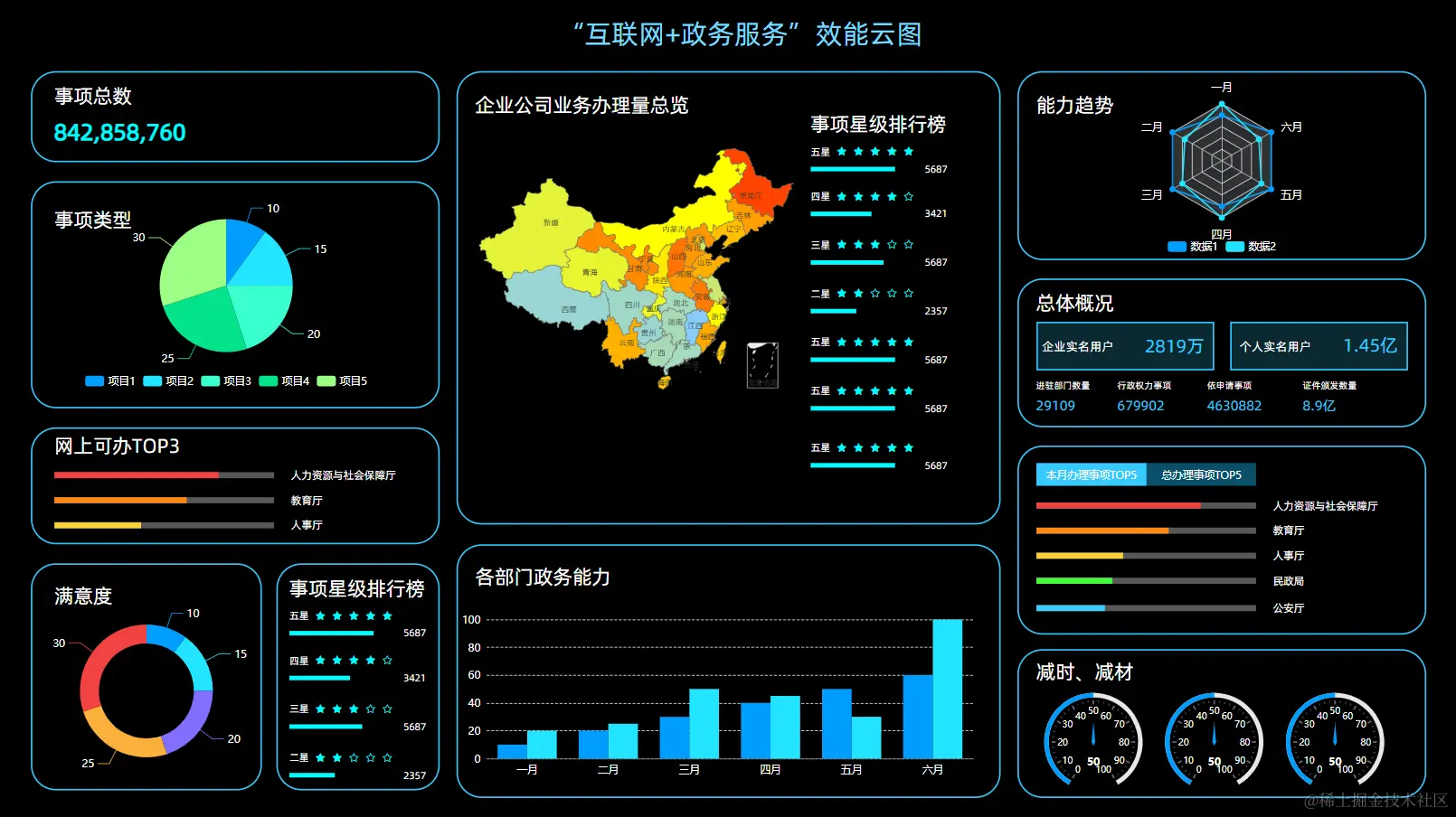 政务服务中很多地方都能用到大屏可视化,如公共资源分配、交通流量数据、市政工程进展、重大事件响应状态和市民服务反馈等,这种形式能明显提升政府服务的透明度和效率,同时增加公众的参与度。