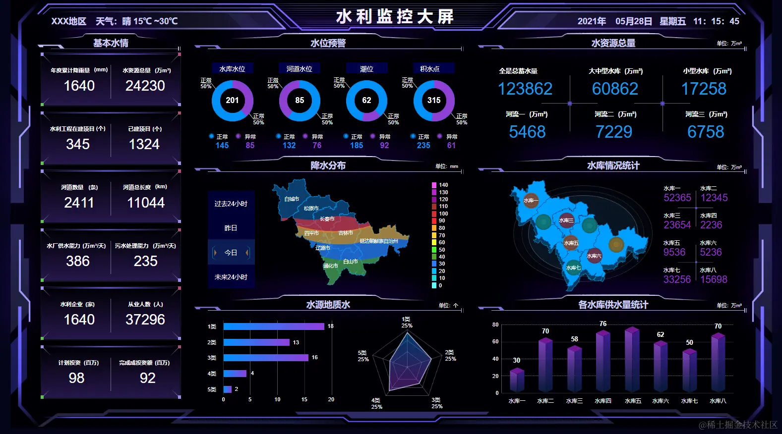 环境监测需要处理大量的实时数据,如空气质量、水利监测、气象数据等,大屏数据可视化能够整合这些数据,提供直观的环境状态图。比如,在洪水季节,水利部门可以利用大屏数据可视化来监控关键区域的水位情况、降雨量、河流流量等,并根据模型预测和实时数据作出快速响应。