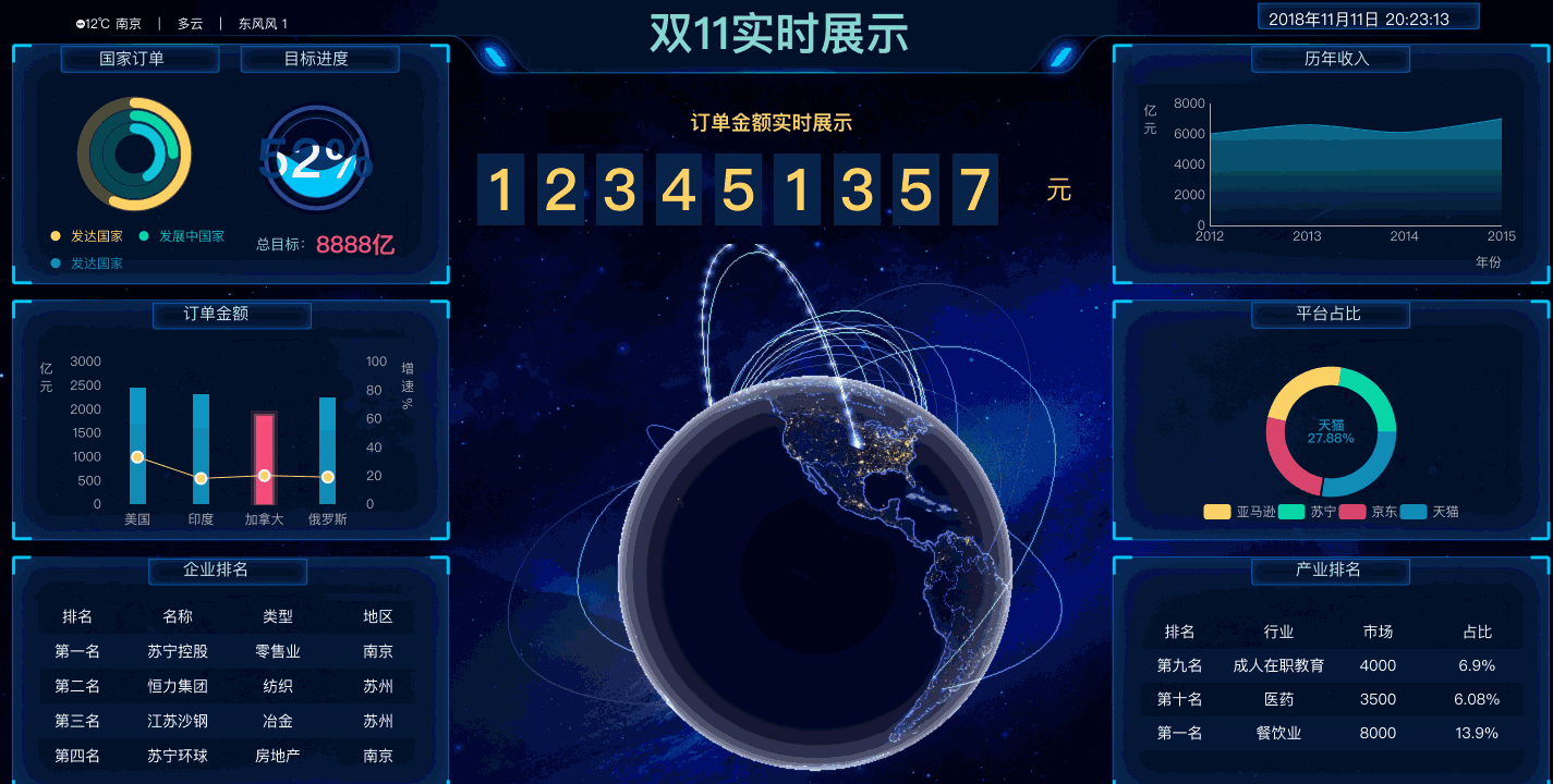 上图是双11数据大屏的实时展示,可以看到,大屏数据可视化有这些特点: