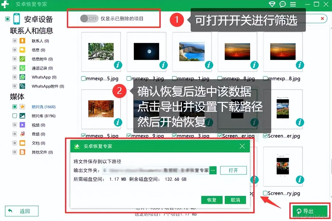 第三步:确定好需要恢复的数据后,点击 【导出】 ,选择保存位置并恢复。在选择保存路径时,建议选择一个安全可靠的存储设备,以免造成数据丢失或泄露。