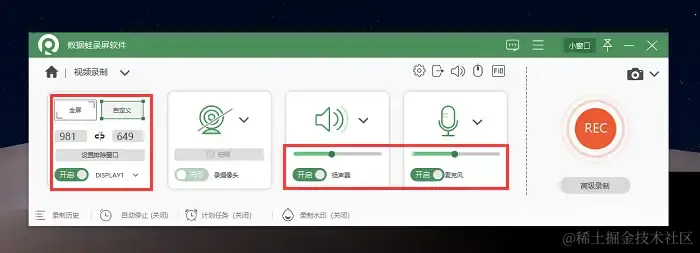 步骤2:在视频录制模式里,选择需要录制的屏幕区域。如果需要录制解说或背景音乐,可以打开“麦克风”或“系统声音”选项。
