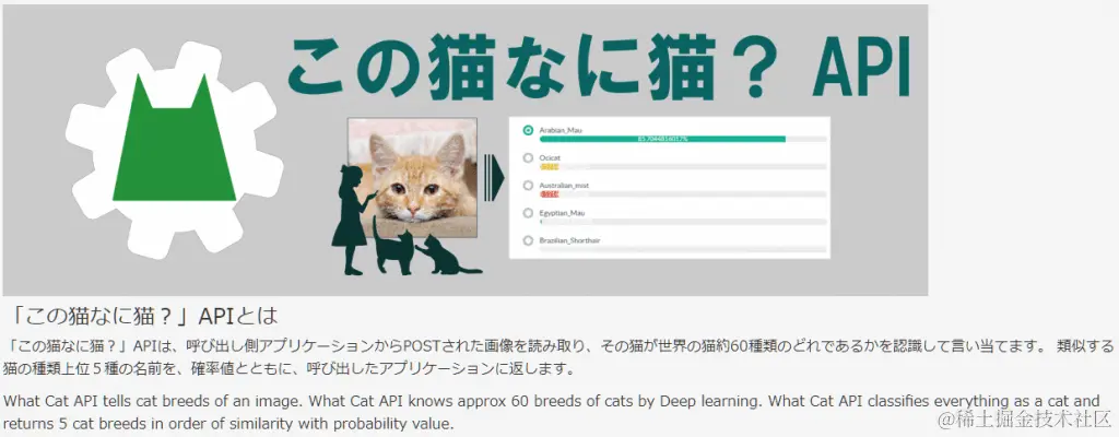 “What Cat”API 读取调用应用程序发布的图像,识别并猜测世界上大约 60 种猫中的哪一种。 将排名前五的相似猫科动物的名称以及概率值返回给调用应用程序。What Cat API 告诉图像中的猫品种。What Cat API 通过深度学习了解大约 60 种猫,并按概率值的相似性顺序返回 5 个猫品种。